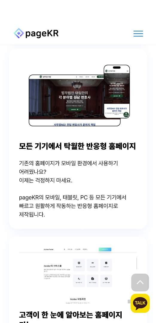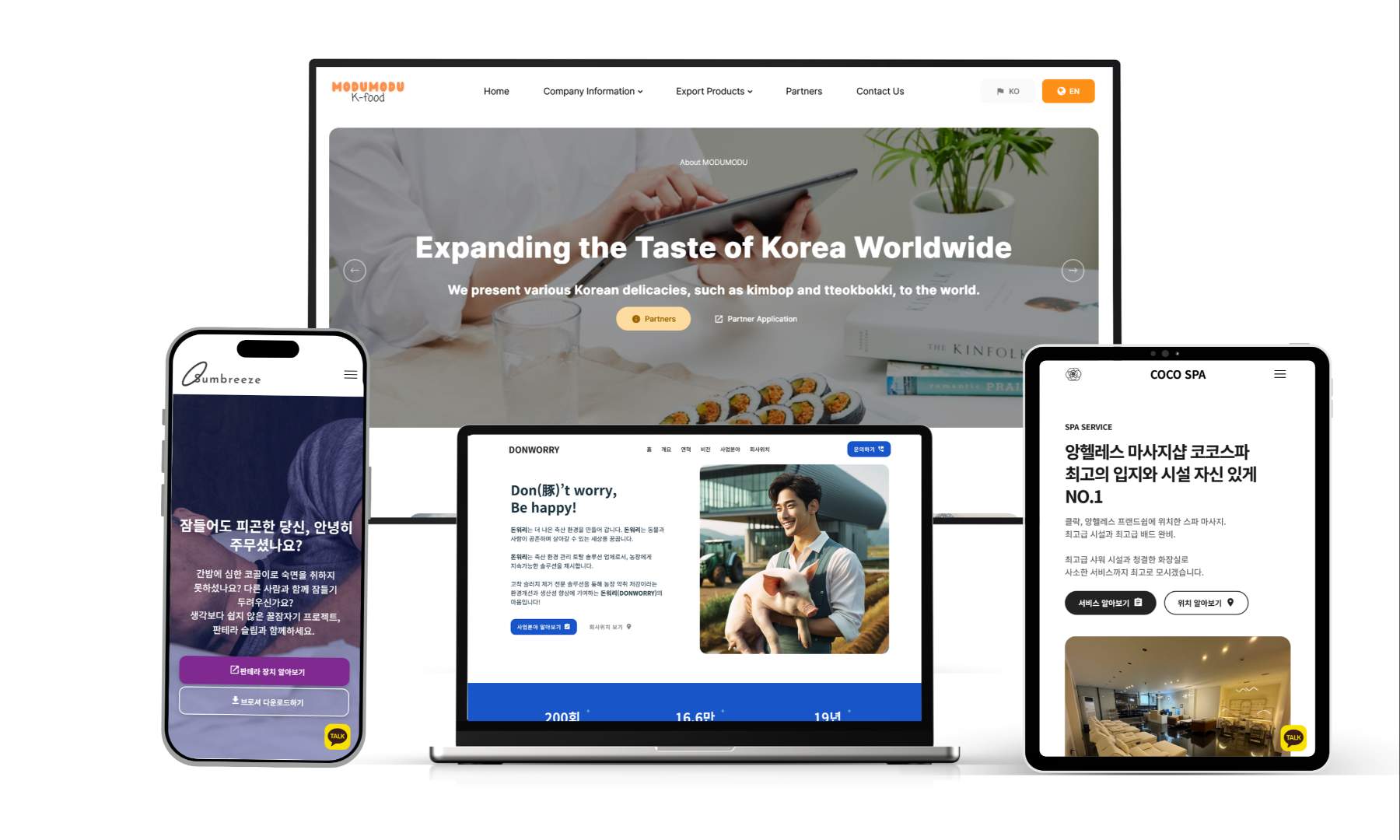 pageKR의 모든 홈페이지는 반응형으로 제작됩니다. 100% 실제 포트폴리오를 통해 모든 기기에서 완벽한 pageKR의 홈페이지를 확인해보세요.