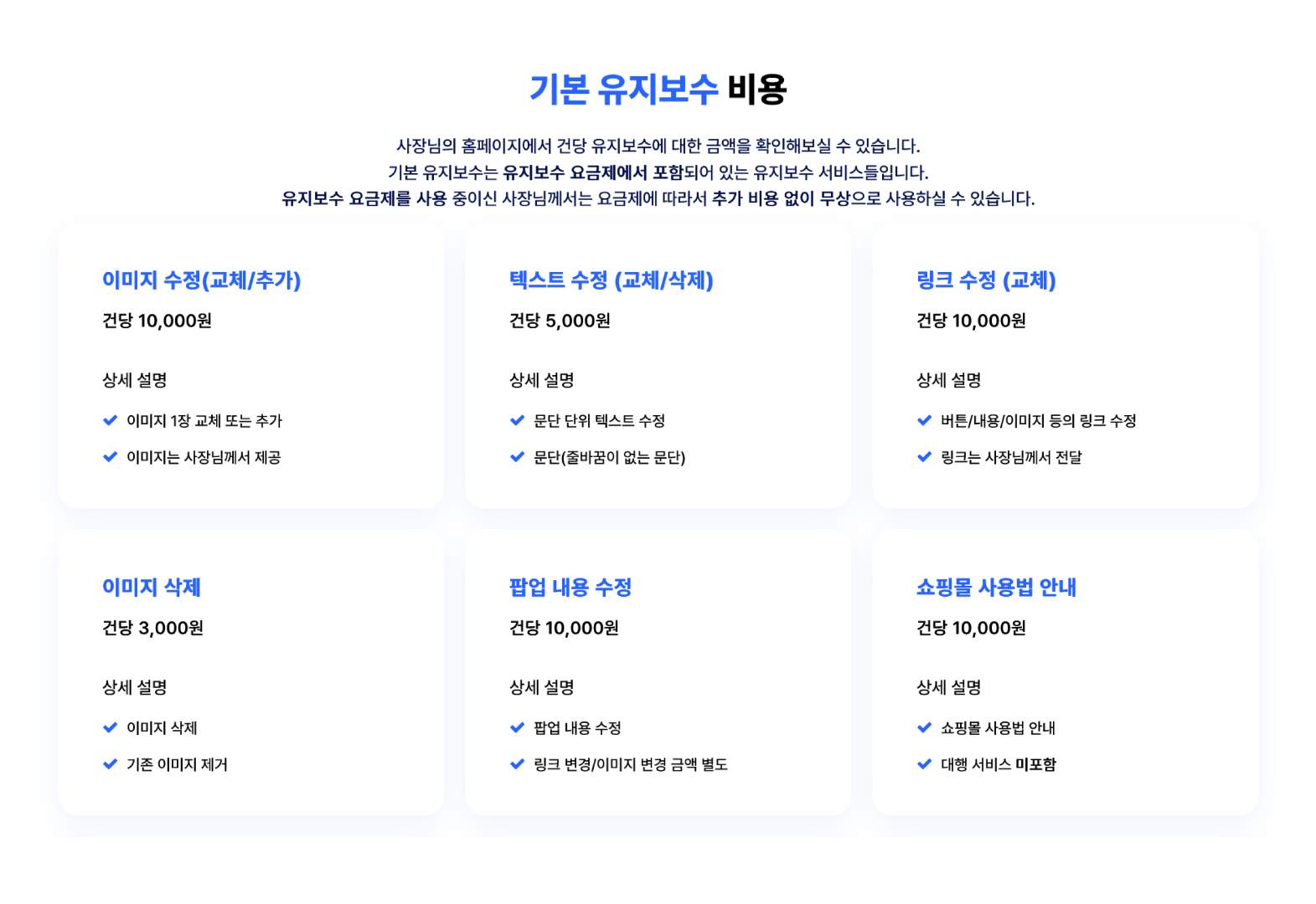 사장님의 원활한 비즈니스 성장을 위해서 pageKR은 모든 비용을 공개하였습니다. 투명한 제작비와 유지보수 요금을 직접 확인해보실 수 있습니다.